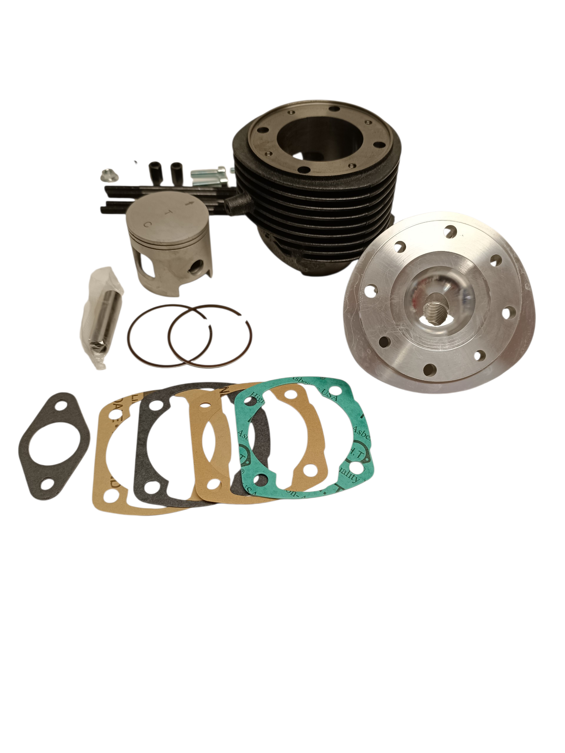 Die Firma VMC bringt gerade die Welt der Tuning Zylinder durcheinander. Mit ihrem 106ccm Zylindersatz der Plug and Play auf die original Ape 50 verbaut werden kann haben wir hier einen Zylinder der Leistungsstark ist und ein gutes Preis - / Leistungsverhältnis aufweist. Der Zylindersatz mit seinem Markanten und Modernen Zylinderkopf wird anderst wie original mit 4 langen Stehbolzen mit dem Motor verschraubt und der Zylinderkof wird zusätzlich nochmals mit 4 Schrauben mit dem Zylinder verschraubt. Somit ist der Zylinderkopf 8mal verschraubt. Das ist bis jetzt einmalig in der Zylinderwelt bei Kurzhubzylindern. Im Satz sind auch 4 verschieden starke Zylinderfußdichtungen dabei um den Zylindersatz optimal an die Quetschkante oben am Kolben anzupassen. Der 106ccm Zylindersatz sollte auf jeden Fall mit einem 19/19er Vergaser , Sportluftfilter , 16er Primärritzel und Sportauspuff gefahren werden. Wer noch das letzte an Leistung aus dem Zylindersatz holen will sollte auch die Überströmkanäle am Motor an die größeren Überströmer vom Zylinder anpassen. Wir bieten daher auch komplette Rennzylindersets mit Vergaser , Auspuff , Zündkerze , Kupplung , Primärritzel, Düse usw. bei uns im Shop an.